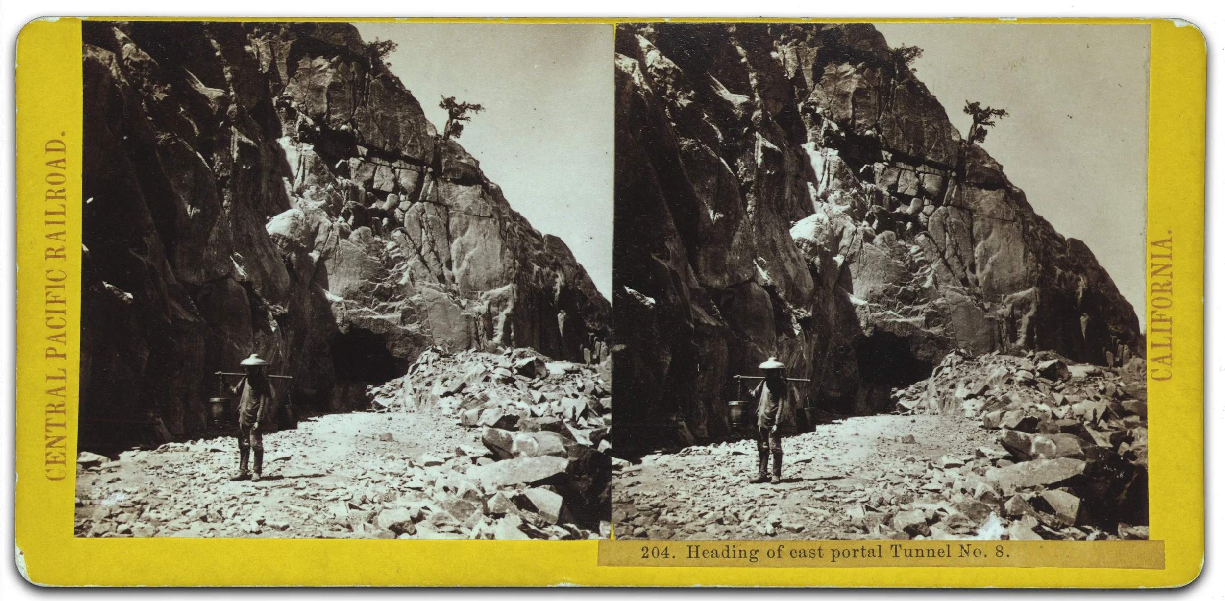 “Heading of east portal Tunnel No. 8” Photograph shows Chinese railroad worker with a shoulder pole. Alfred A. Hart Photographer. 1865 Photo courtesy of the Library of Congress